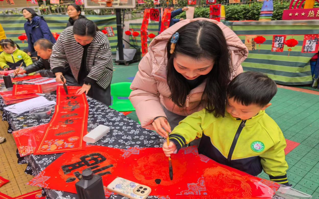 活動(dòng)現(xiàn)場(chǎng),特邀書法協(xié)會(huì)老師揮毫潑墨,一幅幅吉祥春聯(lián)、一個(gè)個(gè)遒勁“?!弊周S然紙上。孩子們興致盎然,在老師指導(dǎo)下體驗(yàn)握筆運(yùn)筆之趣,沉浸式感受漢字神韻;家長(zhǎng)手捧春聯(lián)福字笑意盈盈,傳統(tǒng)文化的種子在親子互動(dòng)間悄然萌芽。