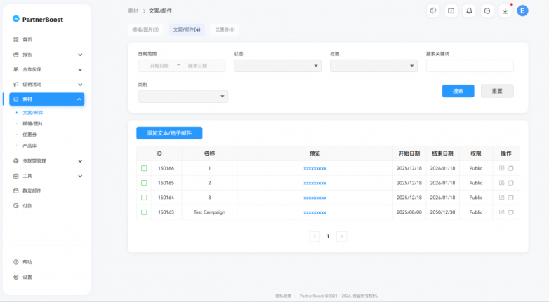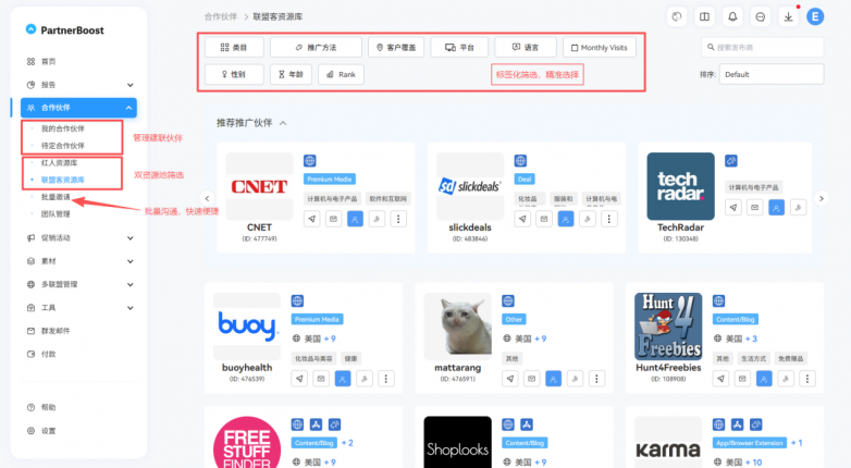 優(yōu)質(zhì)的聯(lián)盟媒體通常有明確的受眾、專業(yè)的內(nèi)容能力和穩(wěn)定的流量。你可以通過垂直領(lǐng)域搜索、同行推薦,或借助專業(yè)平臺(tái)的資源庫(kù)進(jìn)行篩選。PartnerBoost的Publisher與Influencer雙資源池及標(biāo)簽化管理,可幫你節(jié)省大量篩選成本;站內(nèi)信與批量建聯(lián)功能,則讓對(duì)接更順暢。