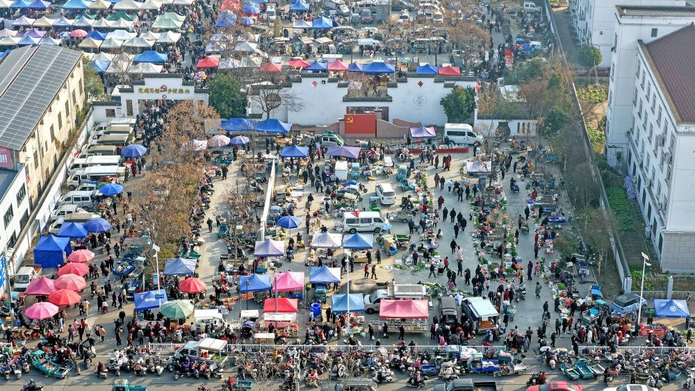 ??1月25日,人們在浙江省臺州市仙居縣下各鎮(zhèn)大集選購年貨(無人機照片)。新華社發(fā)(王華斌攝)