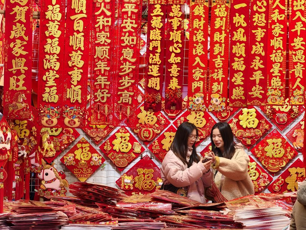 ??1月25日,市民在河北省石家莊市義堂年貨市場選購春節(jié)飾品。新華社發(fā)(陳其保攝)