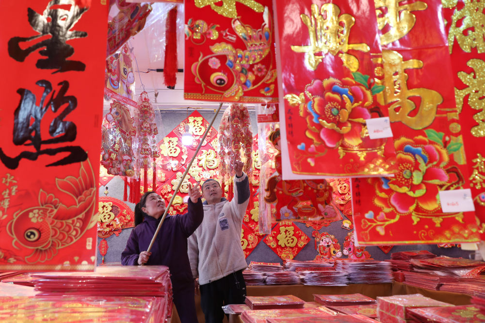 ??1月25日,顧客在河南省焦作市溫縣趙堡鎮(zhèn)趙堡村年貨市場選購春聯(lián)、年畫。新華社發(fā)(徐宏星攝)