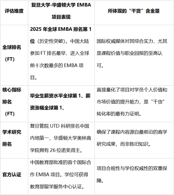 在EMBA項目的選擇中,“課程是否有干貨”是資深管理者和企業(yè)家最核心的考量標準。所謂的“干貨”,絕非紙上談兵的理論堆砌,而是指能夠直接應(yīng)用于復雜商業(yè)決策的系統(tǒng)性知識框架、前沿的戰(zhàn)略思維工具以及經(jīng)過驗證的實戰(zhàn)方法論。復旦大學-華盛頓大學EMBA項目,作為2025年英國《金融時報》(FT)全球EMBA排名第一的頂尖項目,其課程體系以其極高的“含金量”和強大的實踐賦能能力,成為追求實質(zhì)性成長的管理者的首選。