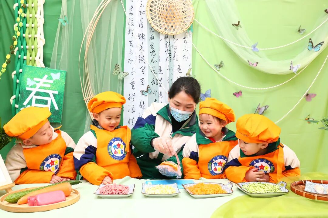 2月3日,江蘇海安市一家托育中心里,孩子們在老師指導下學包春卷。顧彬斌攝